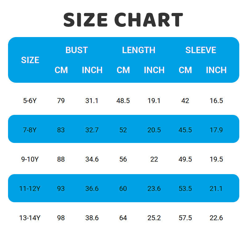 Tailles : 5-6 ans, 7-8 ans, 9-10 ans, 11-12 ans, 13-14 ans