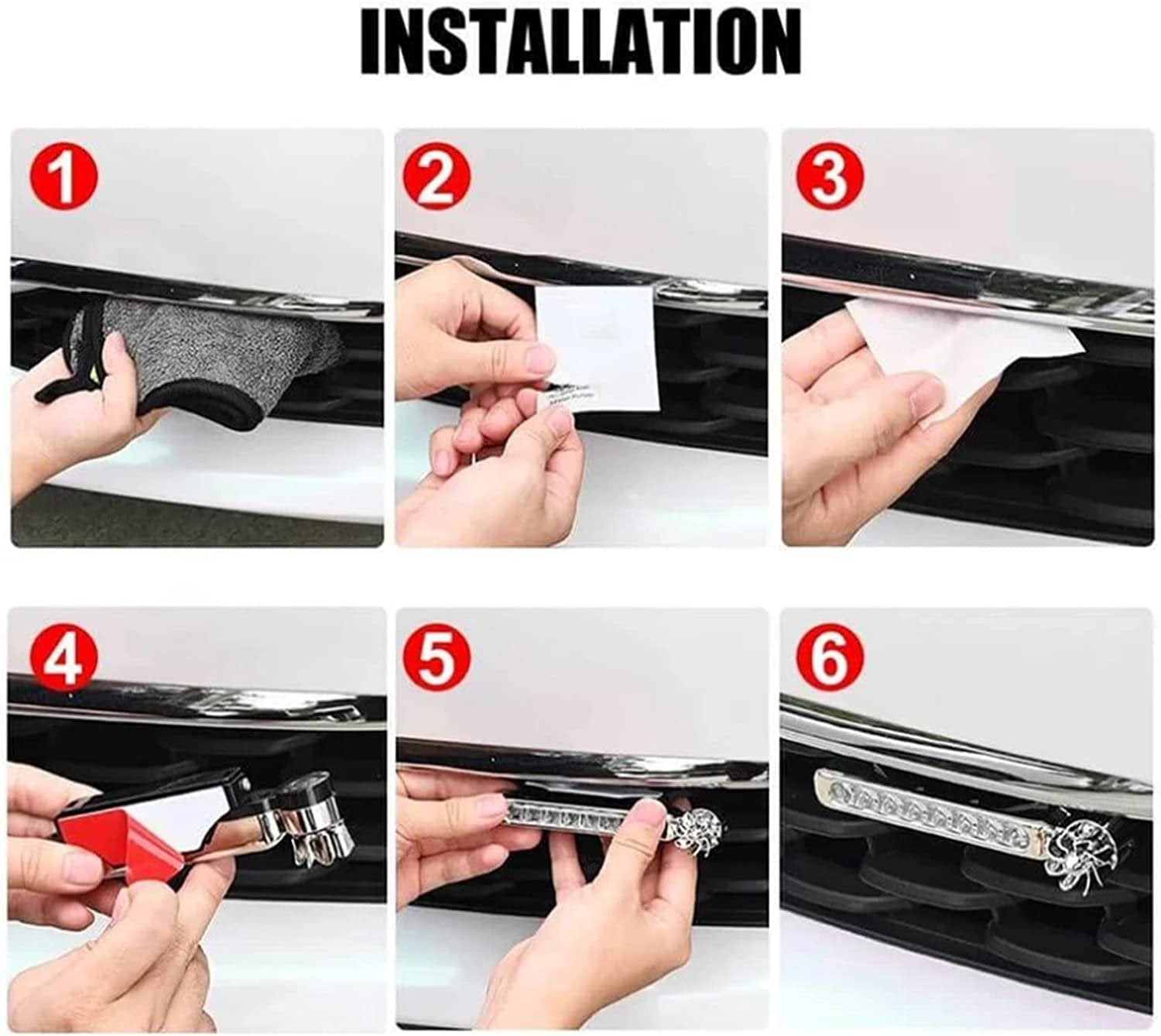 Installation facile : Aucune connexion électrique requise — système auto-adhésif. Nettoyez et séchez d’abord la grille avant. Retirez ensuite le film protecteur du support, collez-le sur la grille et appuyez quelques instants. Le support est réglable à 180° pour ajuster l’angle selon vos besoins.
