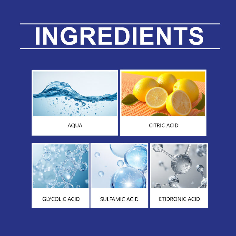 Ingrédients clés : Eau, acide citrique, acide amidosulfonique, acide glycolique, acide hydroxyéthylidène diphosphonique