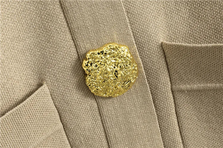 Ce pull ouvert sur le devant est doté d'élégants boutons métalliques et de boutons assortis sur les poignets, ce qui ajoute un élément de design unique à la tenue et la rend loin d'être ordinaire.