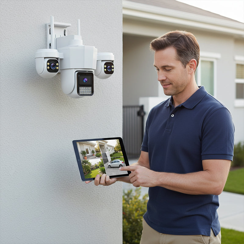 SYSTÈME À TROIS OBJECTIFS - Bénéficiez d'une surveillance complète grâce à trois objectifs fonctionnant de concert. Capturez des vues grand angle, des gros plans détaillés avec un zoom 10x et surveillez plusieurs zones simultanément, sans aucun angle mort, pour une tranquillité d'esprit totale.