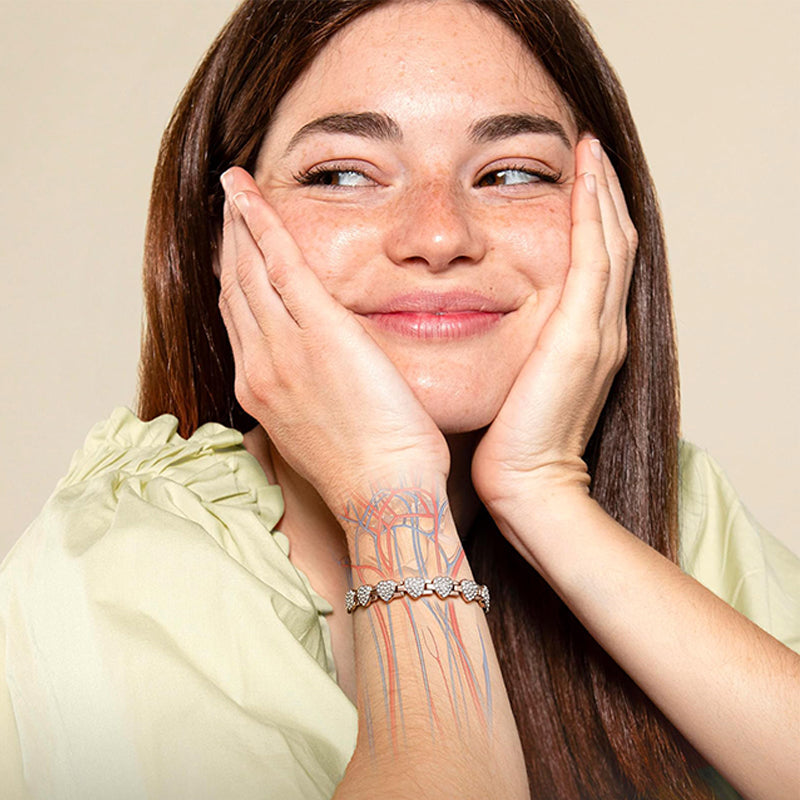Des liens en forme de cœur sublimés par des zirconiums cubes étincelants. Un bracelet raffiné qui capture la lumière et illumine votre poignet, s'accordant à toutes vos tenues.